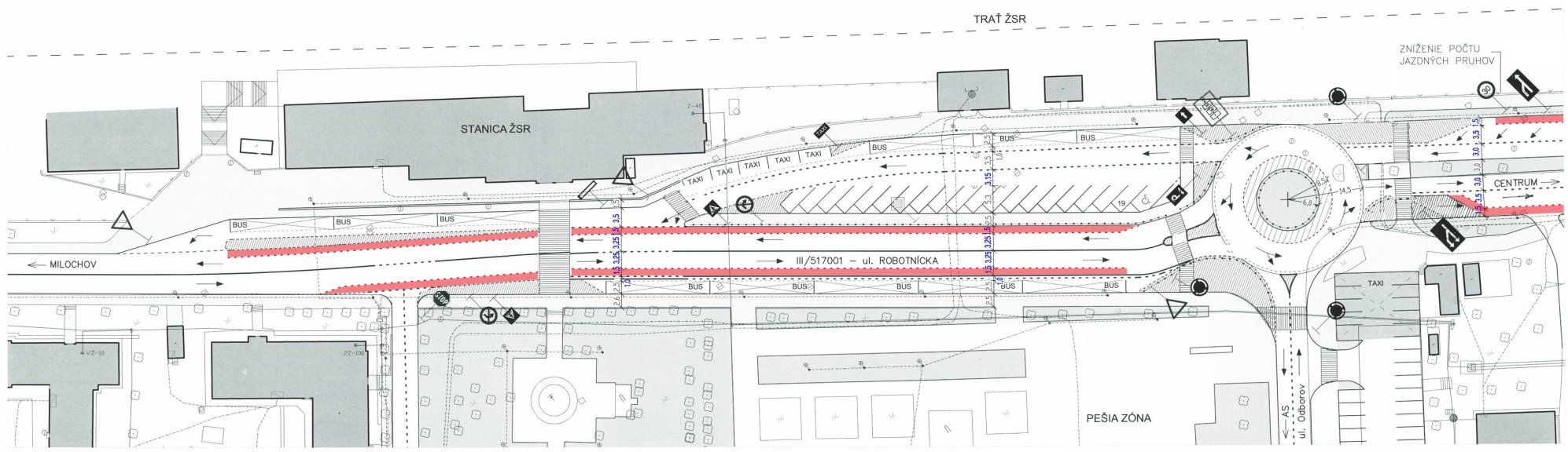 Návrh riešenia cyklopruhov pred železničnou stanicou v Považskej Bystrici konzultovaný s dopravným projektantom.
